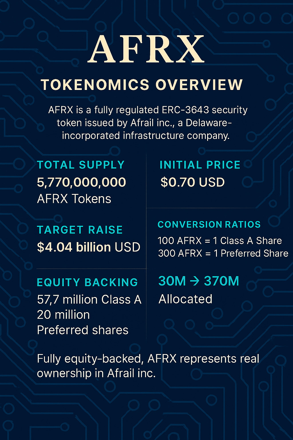 Liquidity (Planned): Afrail Inc. intends to list AFRX on compliant digital securities exchanges.